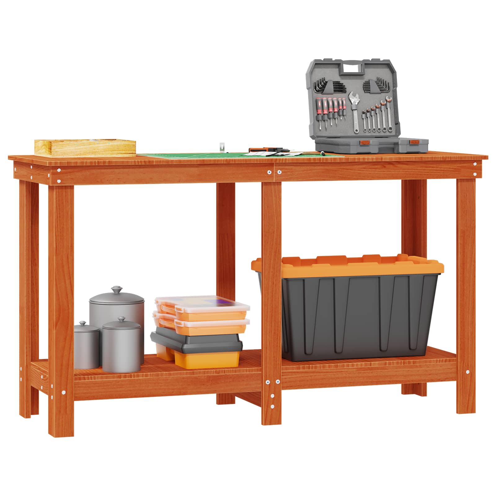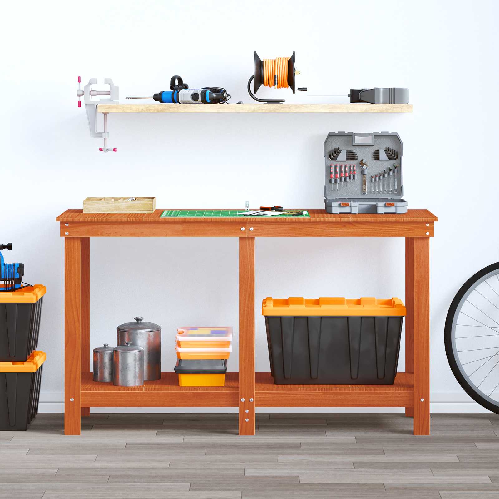 - Bygget i massivt fyrretræ: Bænken er holdbar og ser godt ud, lavet af massivt fyrretræ, som giver en robust overflade til forskellige opgaver. Fyrretræets tidløse look tilføjer en rå, men moderne stil, der passer til både kontor og garage. Holdbarheden lover langvarig brug og er en god investering for dem, der vil have kvalitet.