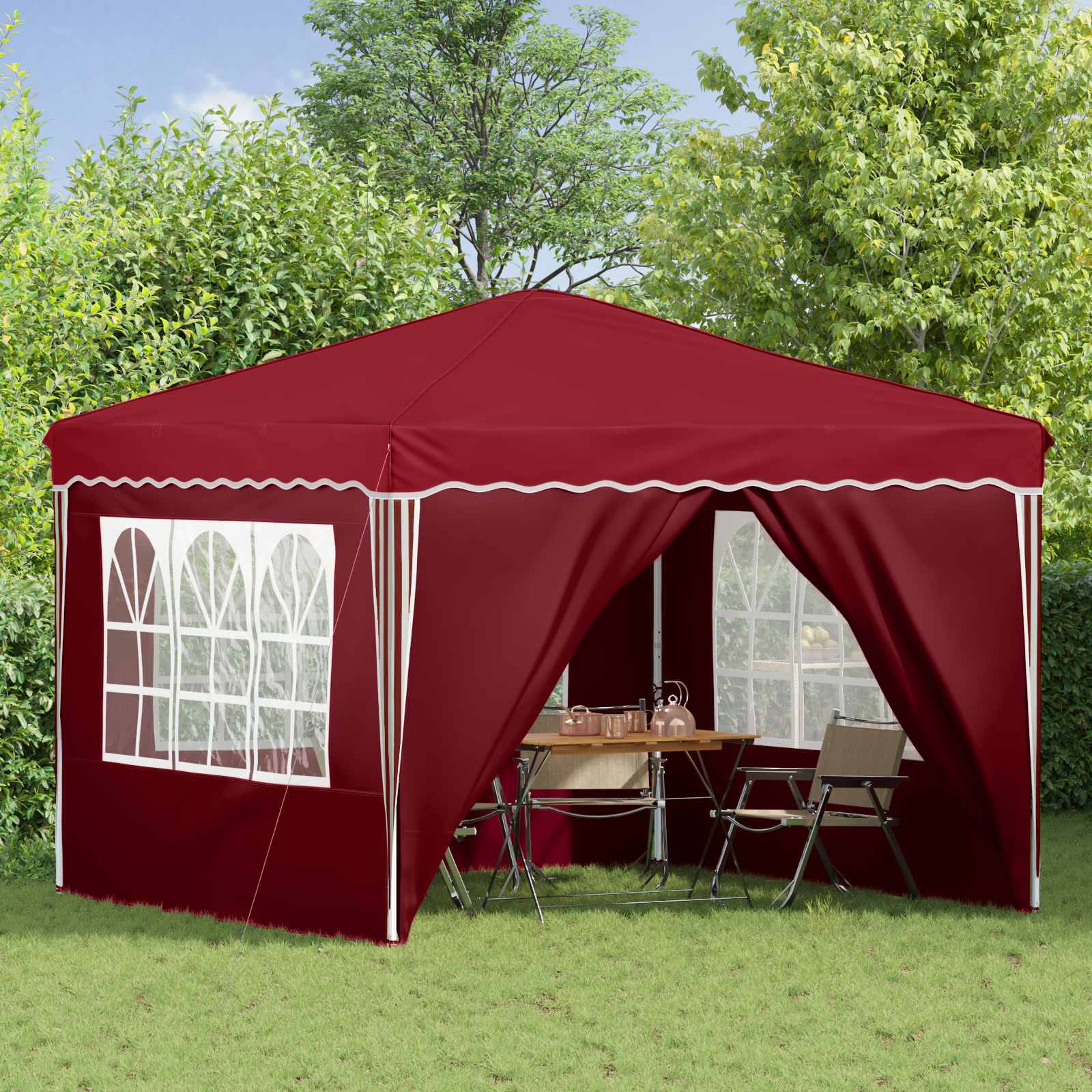 - Materialer: Teltet er lavet af Oxford-stof, der er slidstærkt og vandtæt, vilket sikrer, at det holder længe, selv under skiftende vejrforhold. Stofmaterialet giver også UV-beskyttelse, så gæsterne kan være trygge under solen. Stålrammen er pulverlakeret for stabilitet og holdbarhed.