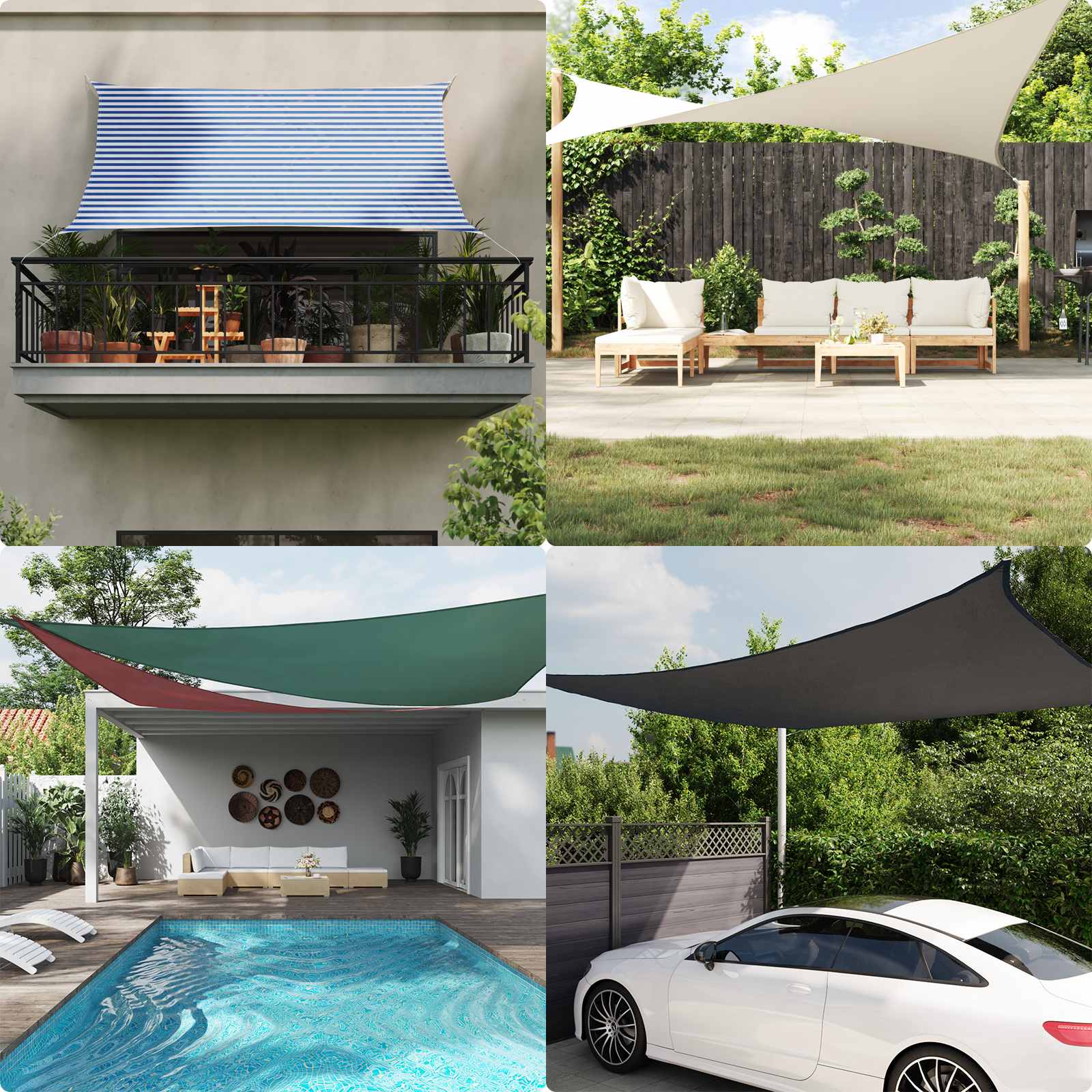 • Sikre komponenter: Sejlet har rustfrie ståltriangelfastgørere i hjørnerne, som gør opsætning nemmere og sikrer stabilitet.